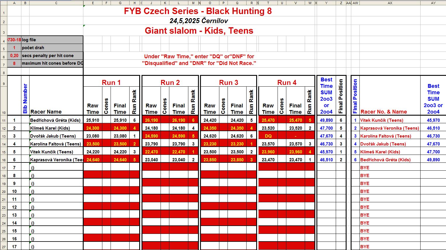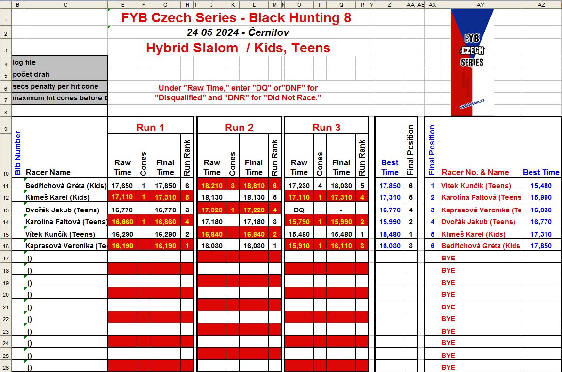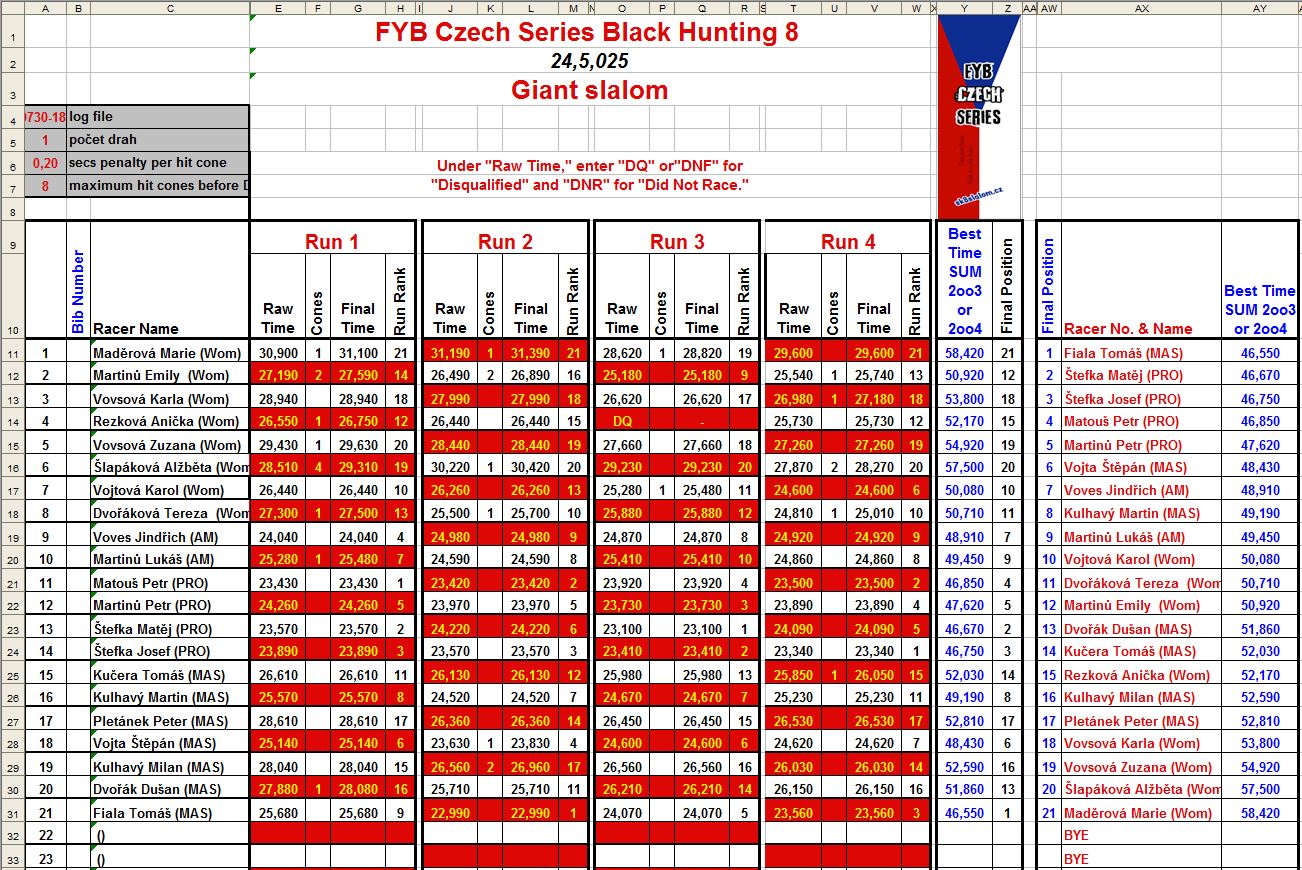 Závod se pojede jako OPEN ale pro hodnocení do Českého poháru a rankingu ISSA budou rozděleny podle kategorií. Pokud se podle počasí něco neodjede v sobotu, po dohodě je možné to odjezdit v neděli, případně přidat i Tight Slalom. Pro kategorii KIDS, bude nižší start a trať bude pro ně zkrácena.